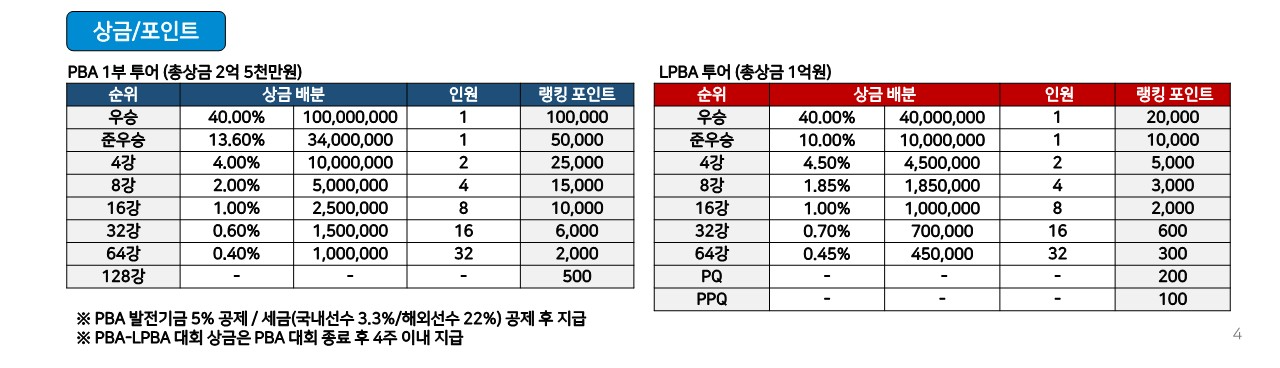 대회일정 | LPBA: 2024년 10월 20일(일) ~ 27일(일) PBA: 2024년 10월 22일(화) ~ 28일(월) |