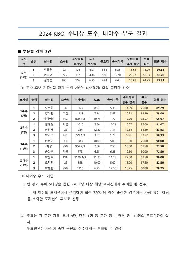 | KBO 수비상 | 수비 지표(25%) + 구단별 투표(감독, 코치, 단장) 투표(75%) |