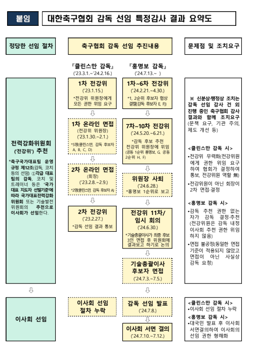 이번 감사에서 클린스만 감독과 홍명보 감독 모두 선임 과정에서 규정을 어긴 사실이 확인되었어요.