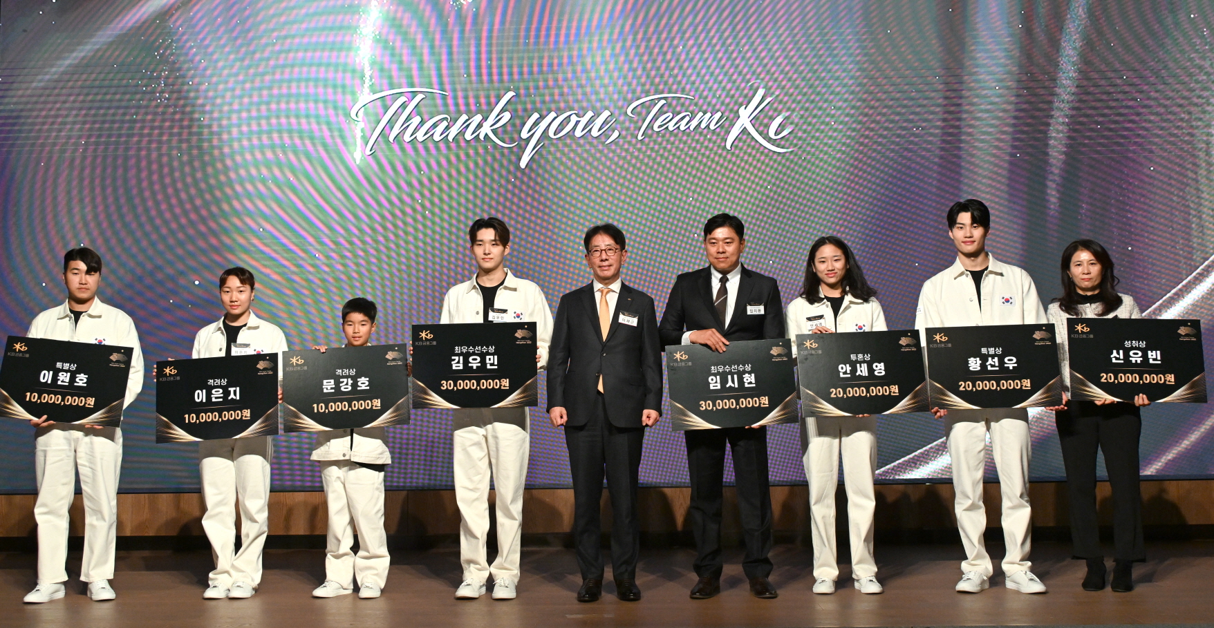 항저우아시안게임에서 우수한 성적을 거둔 우리 선수들에게는 KB금융그룹에서 격려금을 전달하였다. 최우수선수상(MVP) 수영 김우민, 양궁 임시현 선수(각 3,000만 원), 투혼상 배드민턴 안세영 선수(2,000만 원), 성취상 탁구 신유빈 선수(2,000만 원), 격려상 스케이트보드 문강호 선수, 수영 이은지 선수(각 1,000만 원), 특별상 수영 황선우 선수(2,000만 원), 사격 이원호 선수(1,000만 원)가 수여받았다.