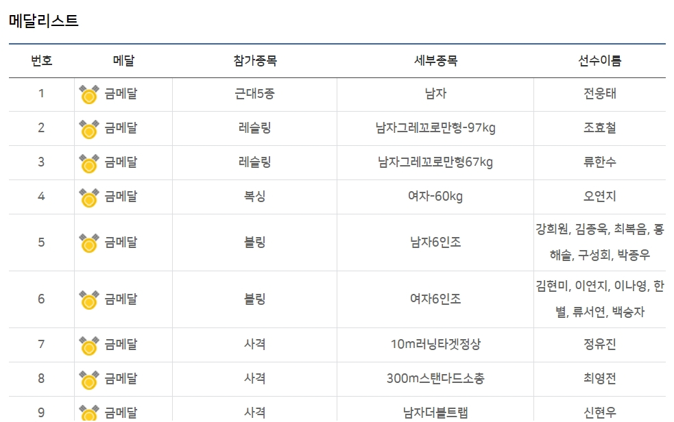 ▶ 대한민국 국가대표 메달 획득 세부현황(바로가기) ◀