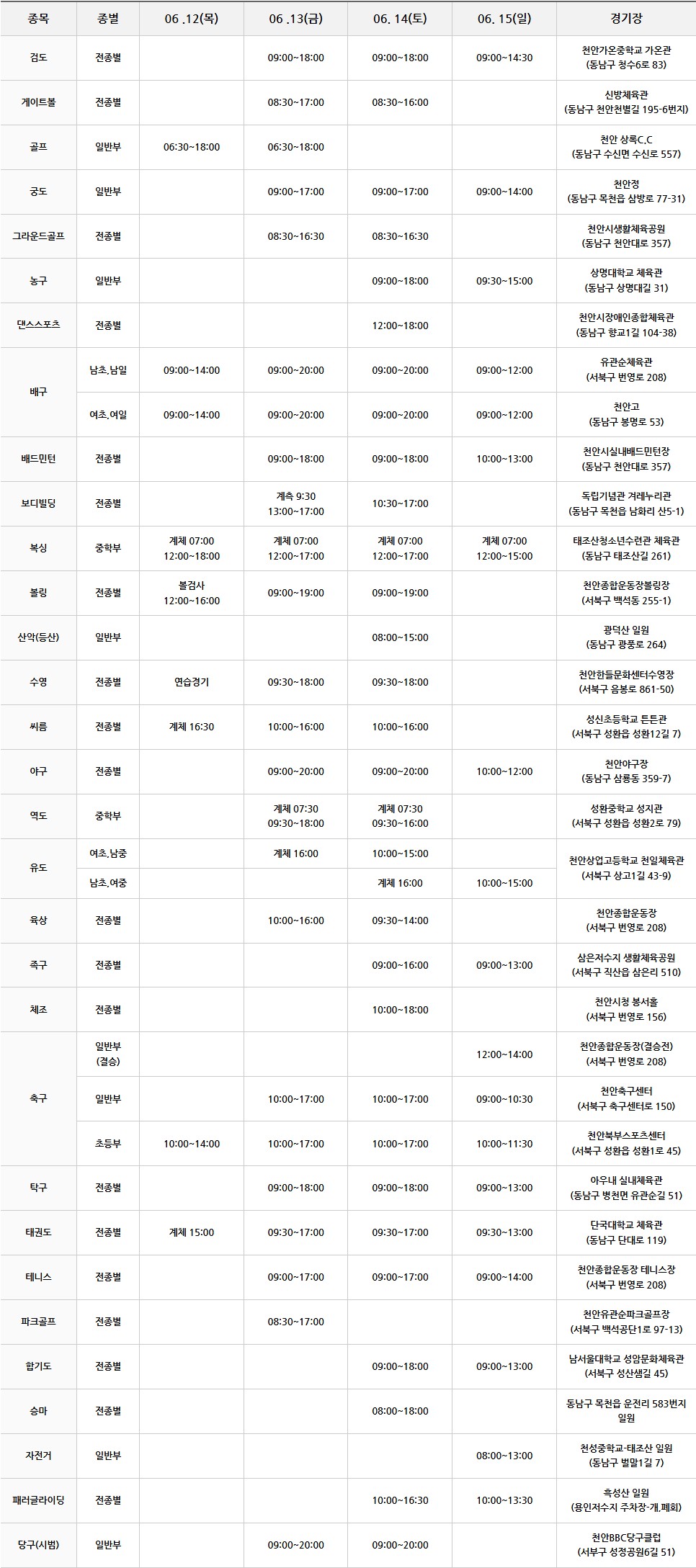 경기 일정은 종목별로 나뉘며, 천안 전역의 다양한 경기장에서 동시다발적으로 열릴 예정이에요.|🎊 폐회식 일정 및 축하공연 가수 👈