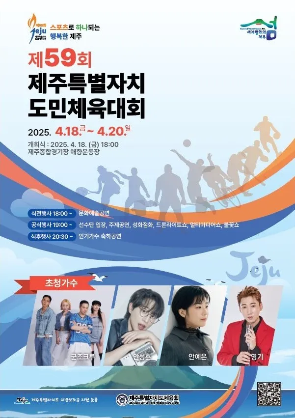 개회식은 4월 18일 금요일, 제주종합경기장 애향운동장에서 개최되며, 군조크루, 안성훈, 안예은, 영기 등 화려한 초청 가수 공연이 함께 열릴 예정이에요. 폐회식은 4월 20일 일요일, 제주복합체육관에서 마무리되고요.