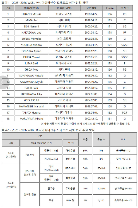 2025~2026 WKBL 아시아쿼터 드래프트 – 지명 순위, 생중계 일정, 참가자 명단 총정리 (여농티비)