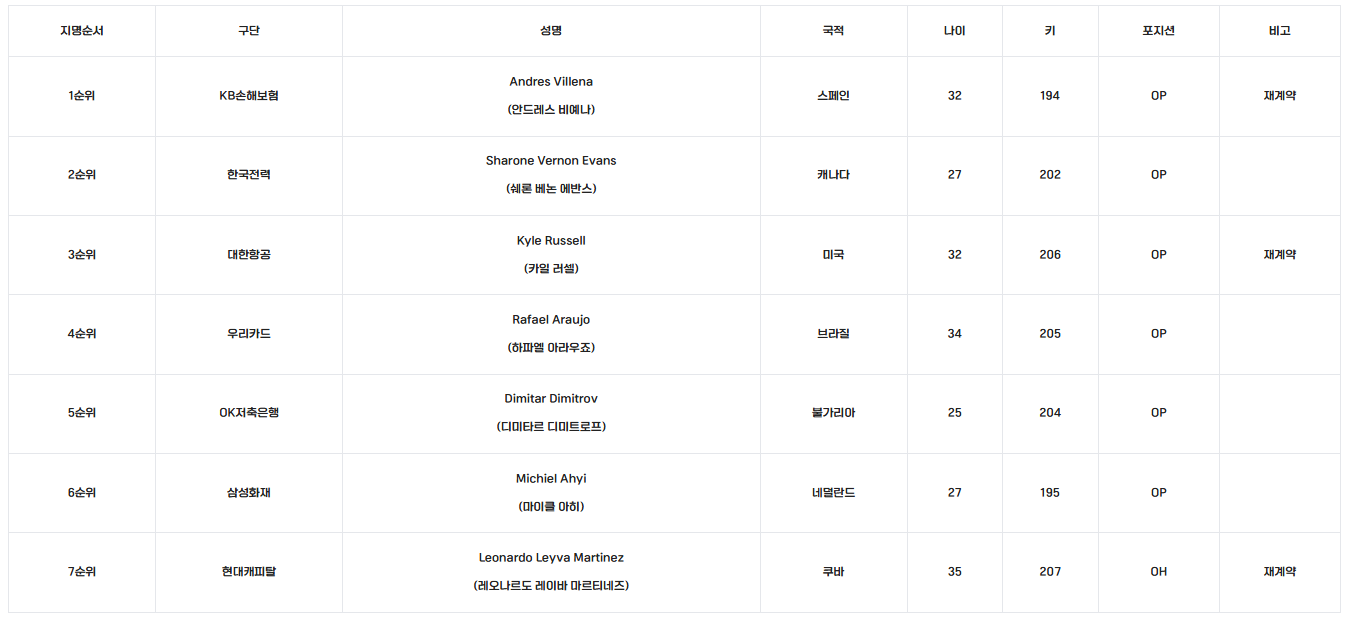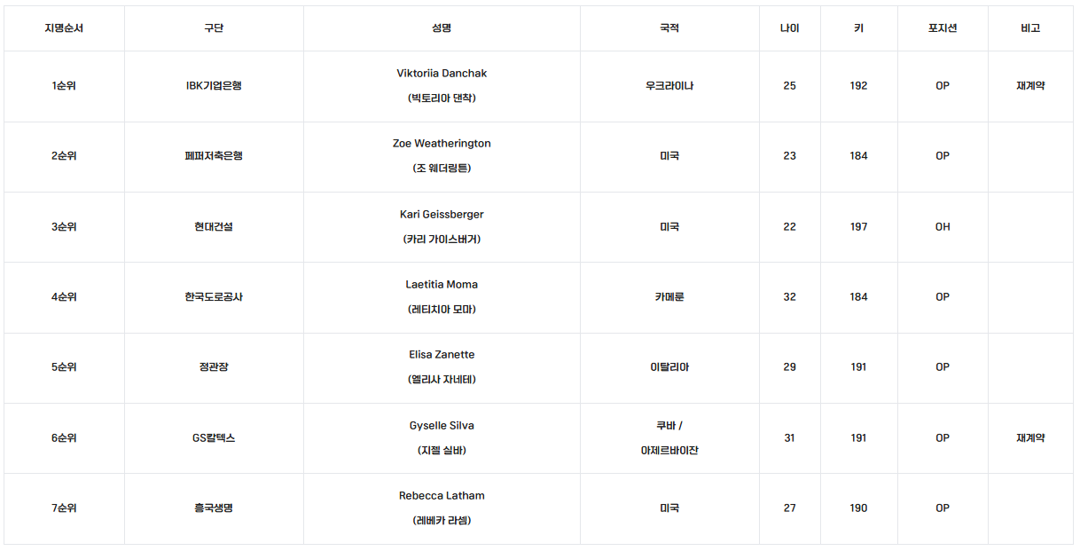 2025 여자부 외국인 선수 드래프트에서는 총 7명의 선수가 지명됐고, 이 중 2명은 재계약 선수였어요.