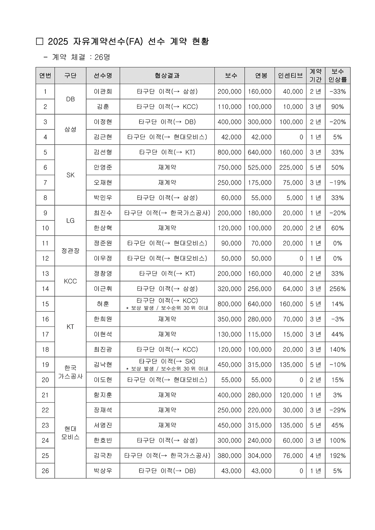 💼 FA 선수별 계약 현황 (계약 체결 26명)