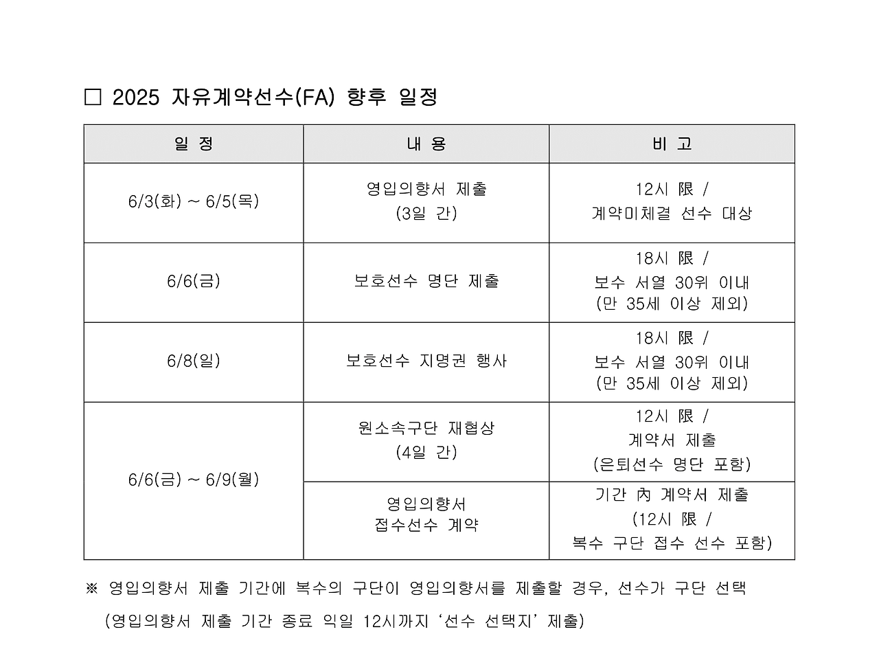 | 6/6(금)~6/9(월) | 원소속구단과의 재협상 기간 |