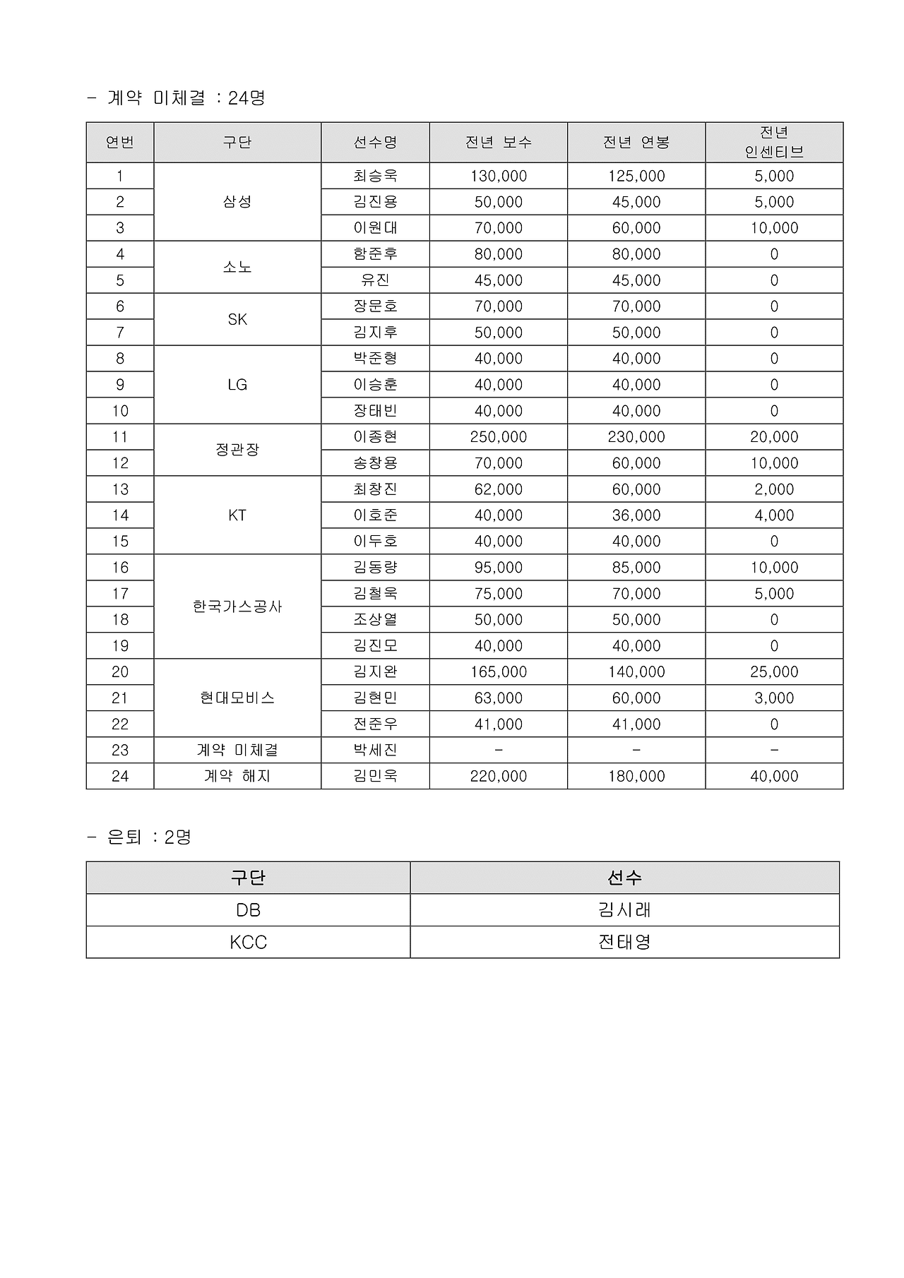| 미계약 선수 | 24명 |