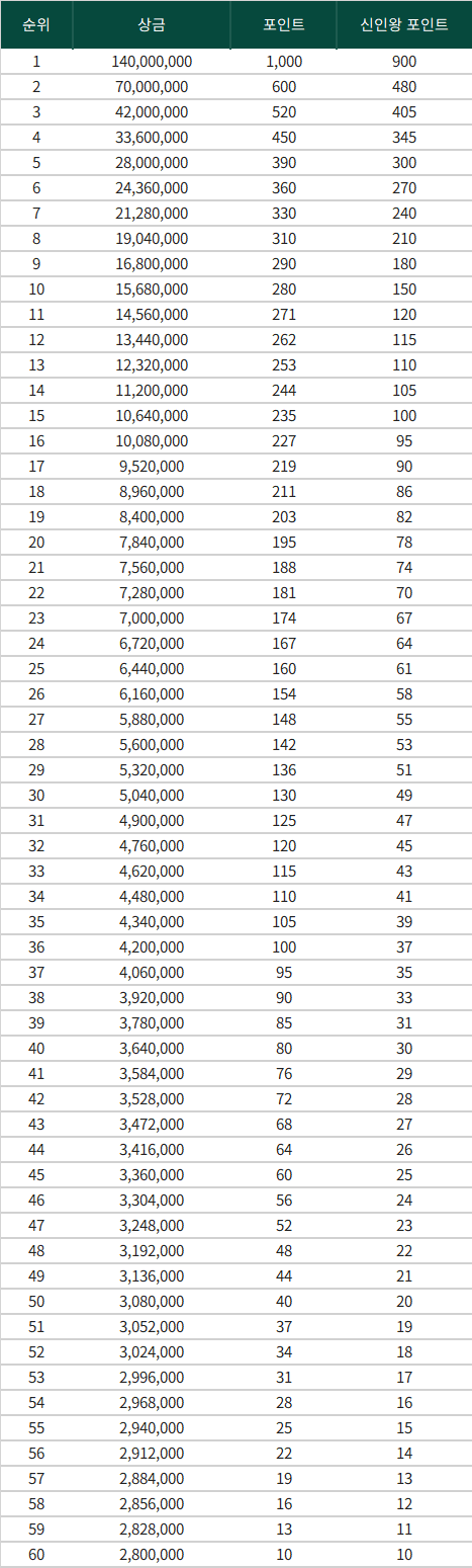 총상금은 7억 원, 우승자는 1억 4천만 원을 받게 돼요. 지난해 초대 챔피언은 김찬우 선수(26세)예요.|💸 순위별 상금·포인트 기준표 👈